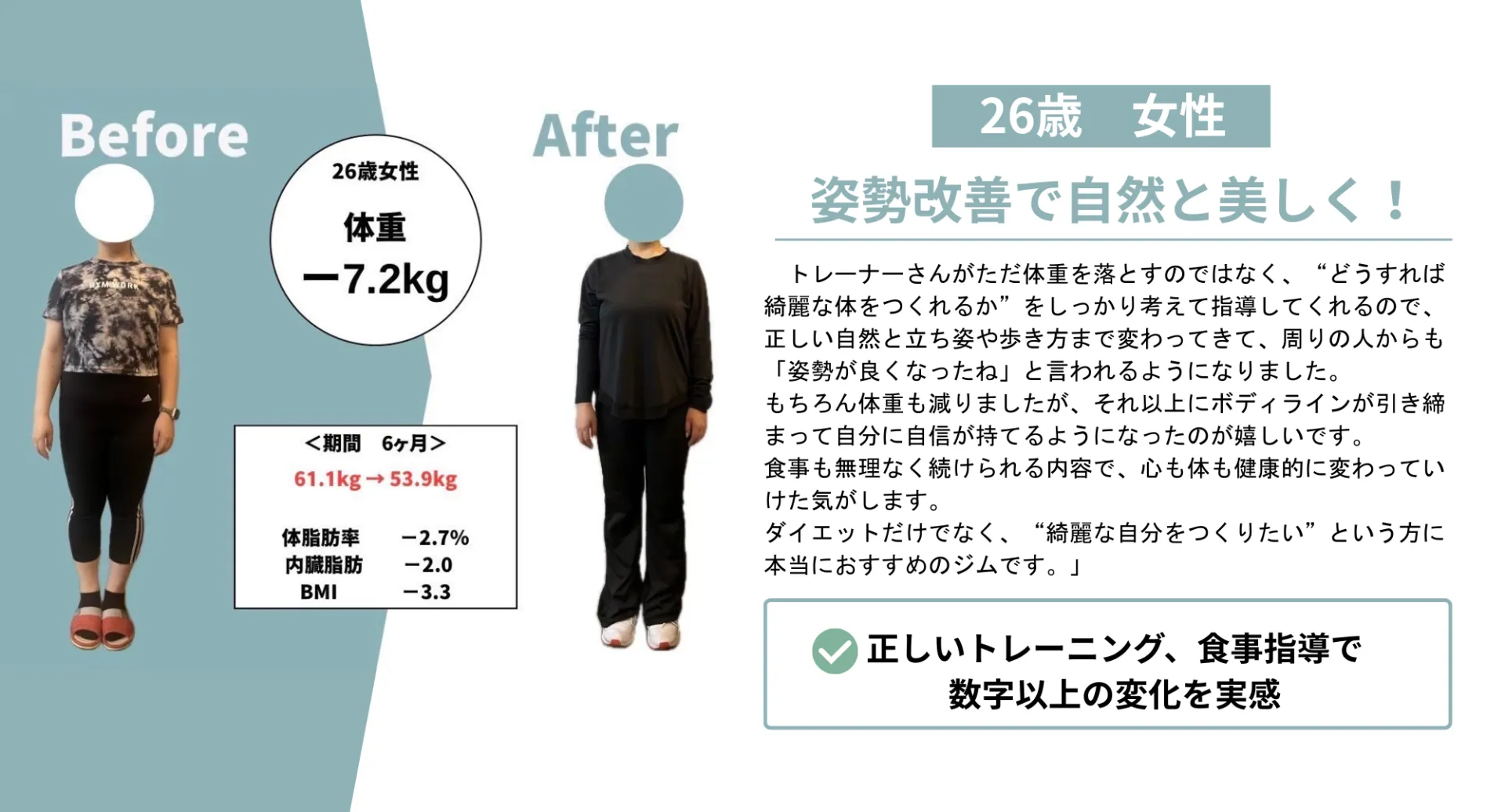 たとえば「忙しくて食事管理が難しい」と感じる方にも、ライフスタイルに合わせた食事内容や、外食時の選択ポイントをアドバイス。プロの目線で継続しやすい方法を提案するため、無理なく理想の体型を目指せます。